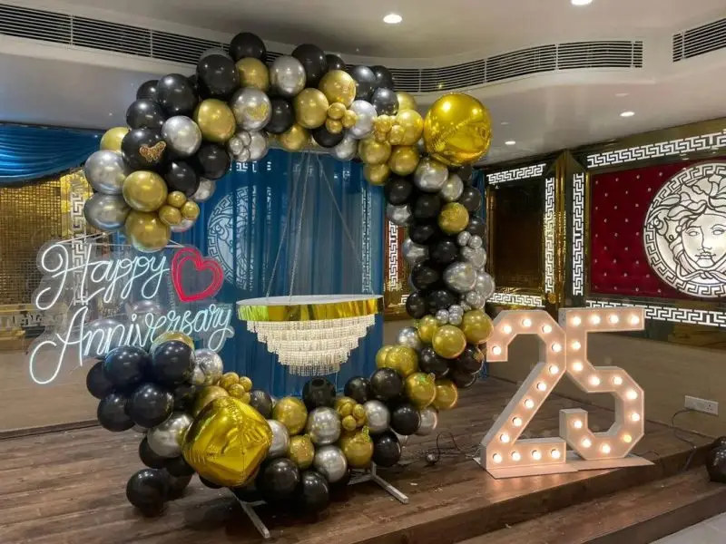 Celebrate a beautiful milestone of love and togetherness with our luxurious 25th Anniversary Banquet Decoration Setup. Designed with an elegant blend of black, gold, and silver tones, this décor creates a grand and sophisticated ambiance—perfect for a memorable silver jubilee celebration.